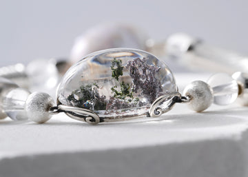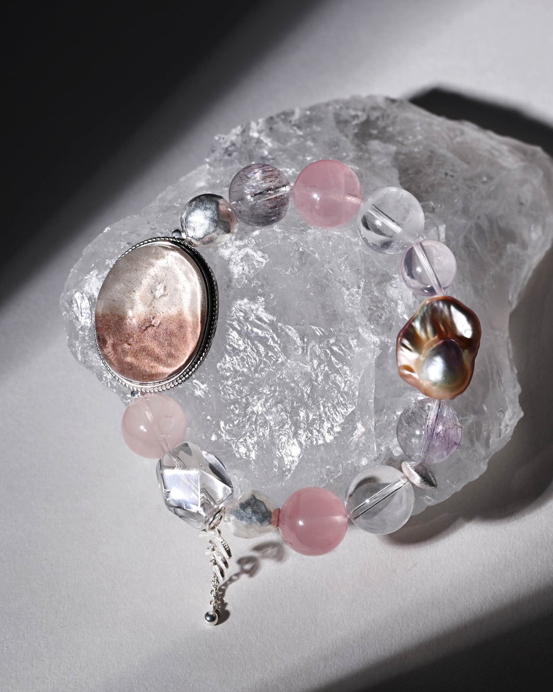 Body: rose quartz, clear quartz, super seven, freshwater baroque pearl, sterling silver